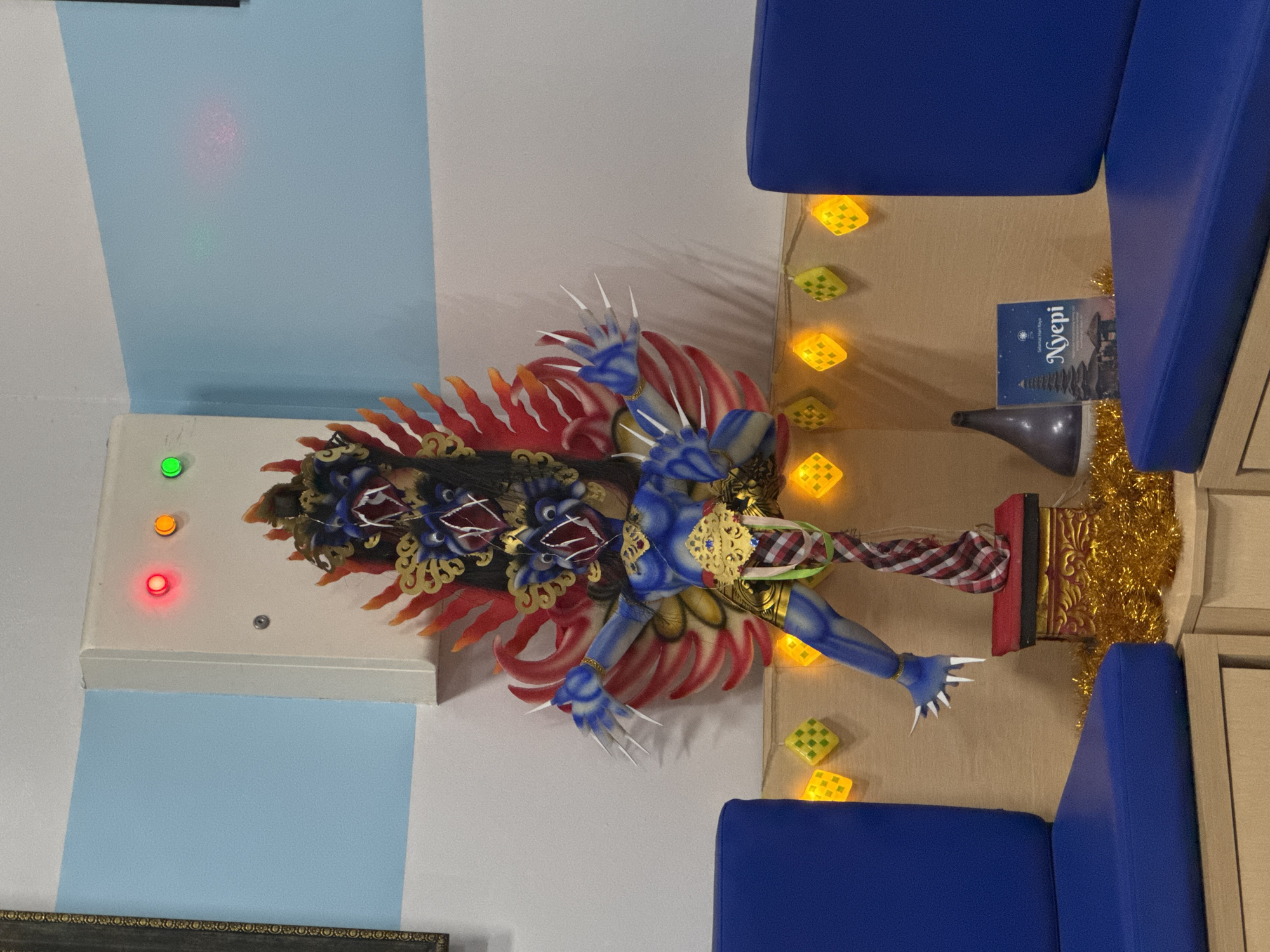 A horizontally oriented photograph depicts a figure of Barong, a Balinese mythological creature, centrally positioned against a backdrop of mixed furnishings and decor. The figure is multicolored, with blue limbs, a black and gold headpiece, and a fiery red and orange aura extending outwards. To the left of the figure, against a white wall with blue accent, there is a control box with red, orange, and green lights illuminated. To the right, a string of decorative lights, shaped like diamonds, illuminates the surroundings adjacent to a blue cushioned bench and light wooden cabinet. A book titled "Nyepi" is situated near the bench. The photograph was taken in Peliatan, Indonesia.