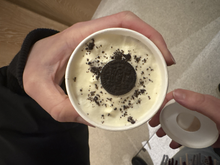 A top-down shot shows a person holding a cup of ice cream with a lid in their hands. The ice cream is a light color, possibly vanilla, and has an Oreo cookie in the center, surrounded by crushed cookie pieces. The cup is white and round. The person is wearing a black sweater. The background appears to be a light-colored surface.