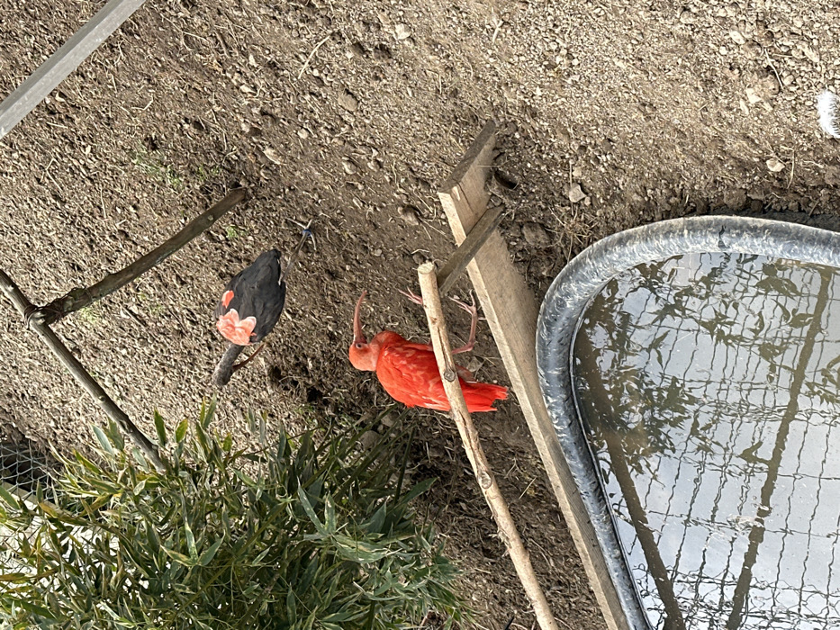 The image displays an outdoor animal enclosure located in Leskovets, Bulgaria. The scene features two birds and various man-made structures on a dry, earthen ground. In the mid-ground, a vibrant red scarlet ibis stands on a horizontal wooden perch, oriented towards the left side of the frame. Its long, curved beak is visible. Below the perch, a flat, wider wooden board is positioned. In the upper-mid ground, behind and to the right of the scarlet ibis, a second bird rests on a dark, horizontal branch or stick. This bird is predominantly black with a distinct patch of reddish-orange feathers on its back and upper wings, and its head is turned towards the right. A blue band is visible on one of its legs. The ground covering most of the scene is dry, light brown soil mixed with small stones and debris. To the upper-left, a section of green, leafy vegetation with narrow leaves is partially visible. The foreground is occupied by a dark-rimmed, oval-shaped trough filled with water, which reflects a distinct grid-like pattern, indicative of overhead mesh fencing or an enclosure structure, along with some distorted vegetation. Several thin wooden branches or stakes are present, supporting elements within the enclosure.