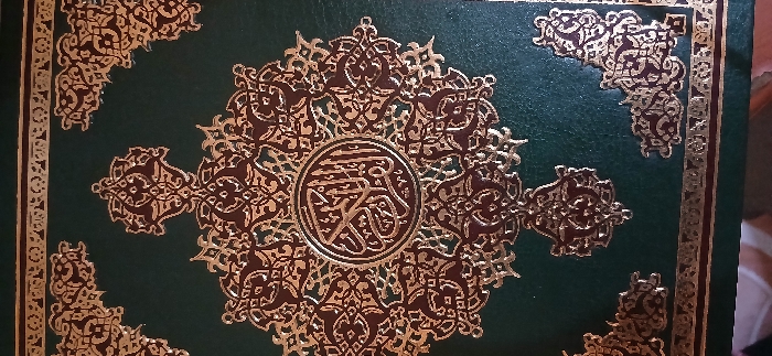green book cover with intricate gold and brown ornamentation. A central medallion features ornate calligraphy. Decorative designs adorn the corners and edges, adding to the richness of the book's appearance. The detailed embellishments suggest a religious or culturally significant text.