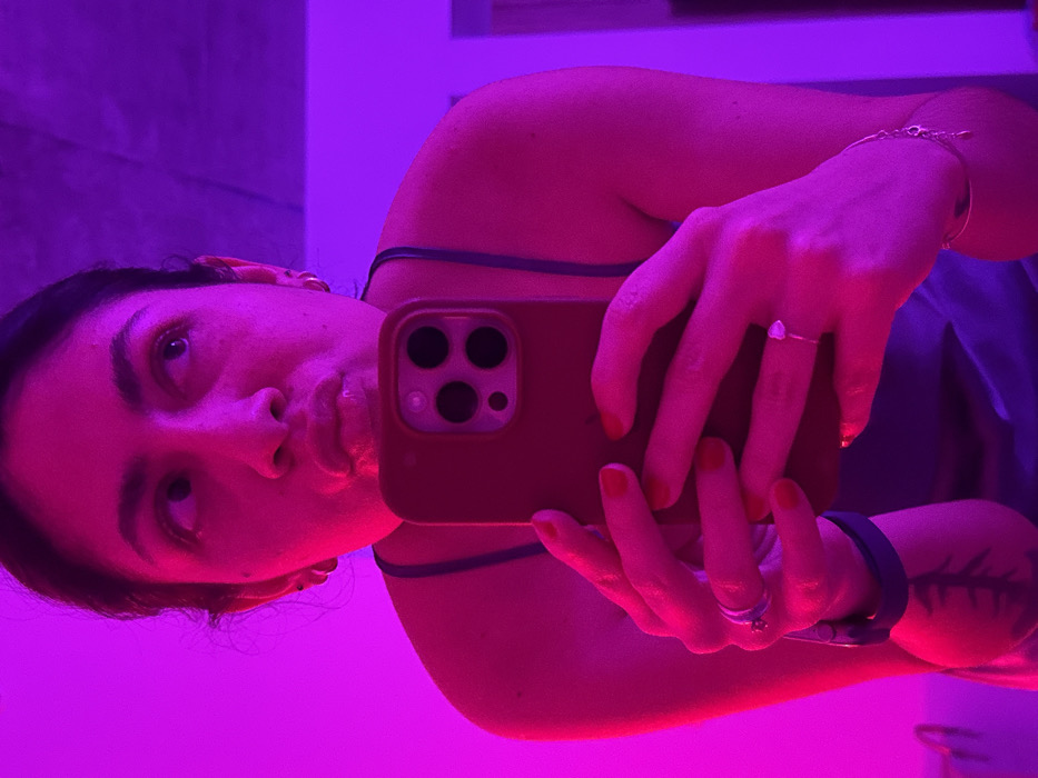 A woman with dark hair pulls a "duck face" expression, holding a red smartphone up to her face for a selfie. She wears a thin-strapped top. The image has a strong magenta or purplish hue. A bracelet is visible on her wrist, along with rings on her fingers. She also has a watch on. The lighting is vibrant and unnatural.