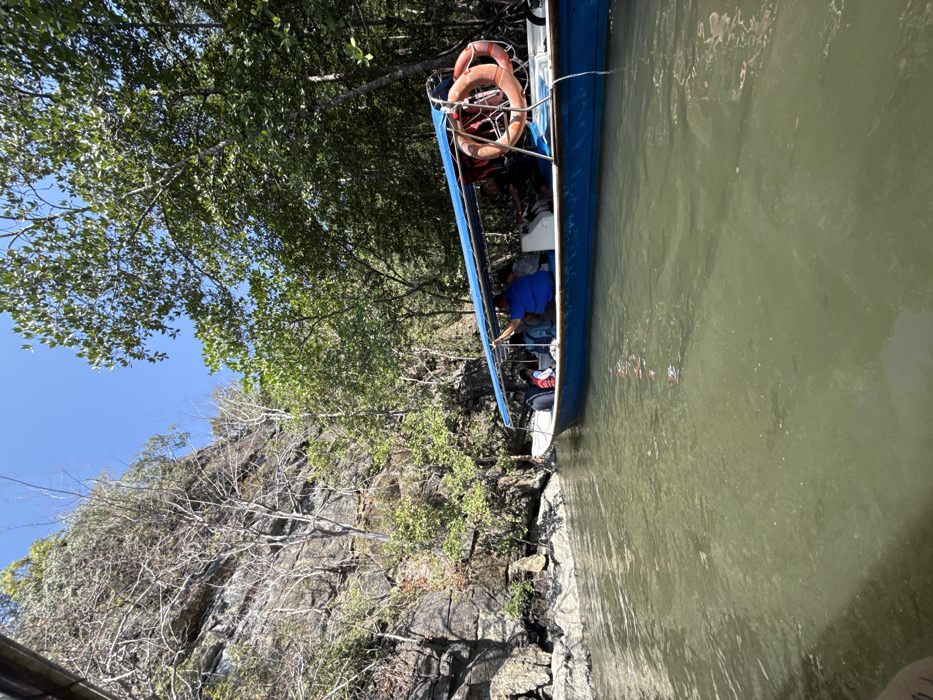 A long, blue boat with a white interior, carrying passengers, is situated on green water near a rocky shoreline. Trees grow from the rocks and along the riverbank. The boat has a life preserver on board. The sky is visible between the trees and appears bright.