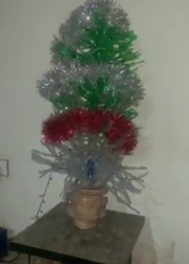 small, homemade Christmas tree standing on a small, dark-colored table against a white wall. The tree appears to be constructed from recycled materials. It has three distinct tiers decorated with tinsel: green on top, silver in the middle, and red on the bottom. The base of the tree is wrapped in a material that resembles ribbons. A string of multicolored fairy lights flickers on and off, alternating between green, red, and white lights. A power outlet is visible on the wall behind the table. Music plays in the background.