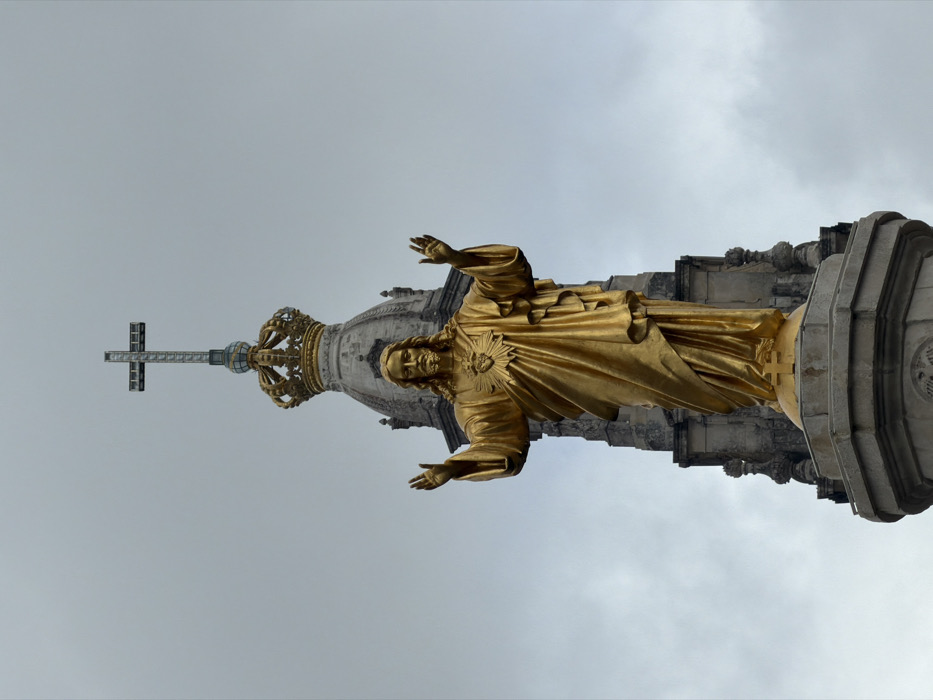 - "A low-angle, eye-level shot captures a golden statue of Jesus Christ against an overcast sky and the upper portion of a grey stone church tower" by FM-7gWCF3, licensed under CC BY 4.0
