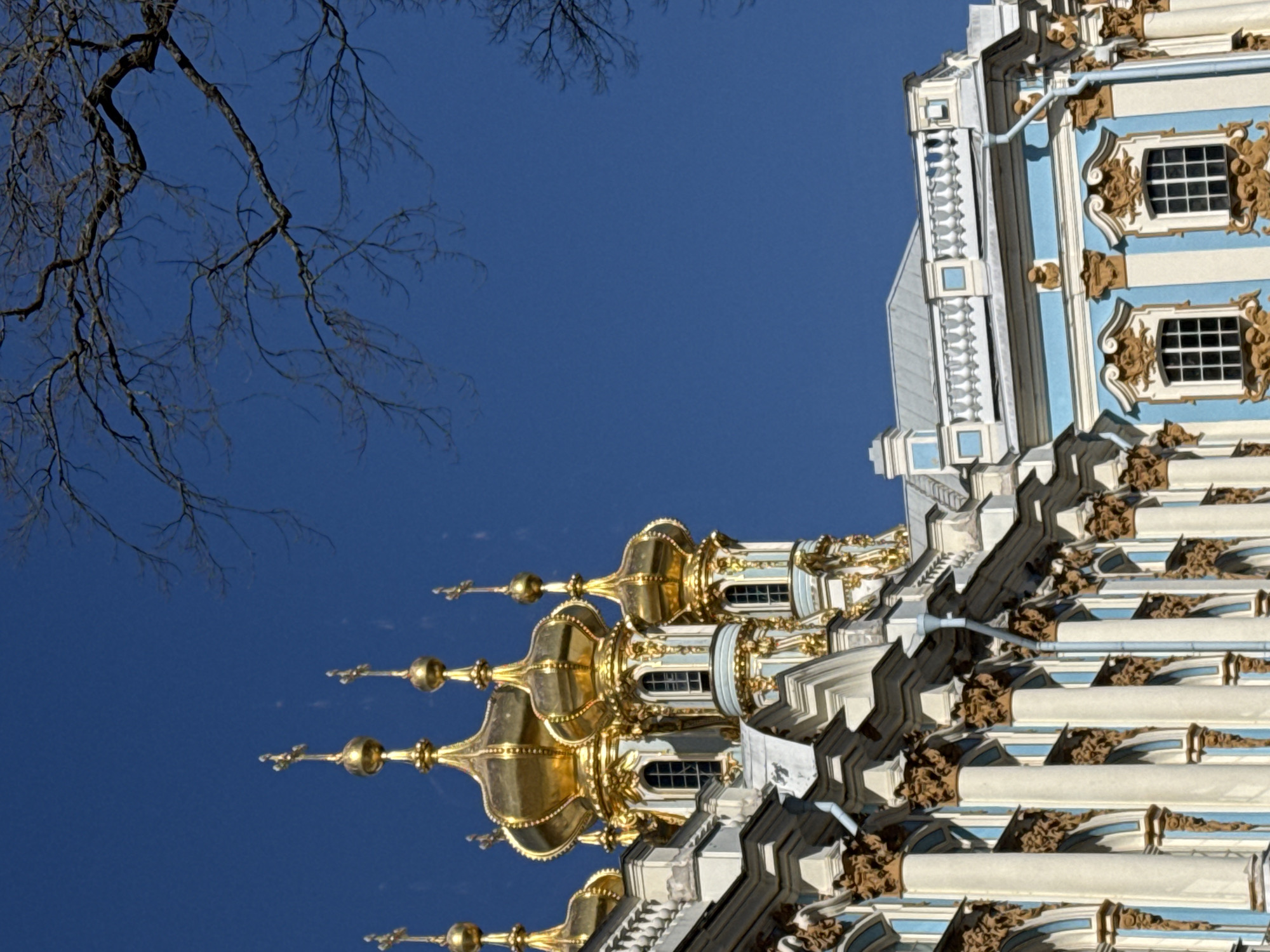 A detailed vertical shot captures a section of a grand building, characteristic of 18th-century Eastern European imperial Baroque/Rococo architecture, under a clear blue sky. The structure features a light blue and white facade, extensively adorned with intricate golden ornamentation. Five radiant golden onion domes, each topped with a cross, are prominent on the upper left, reflecting bright sunlight. Below these domes are several windows with dark grilles, framed by golden details. The main body of the building displays white classical columns with ornate dark gold capitals. Between the columns are recessed sections, some featuring gridded windows with dark panes, others appearing as arched decorative niches. Grey drainpipes run vertically down parts of the facade. A white stone balustrade crowns a lower roof section on the upper right. Bare, dark tree branches are silhouetted against the intensely blue sky in the upper right quadrant. No individuals or discernible activities are present. The scene is illuminated by direct sunlight. This grand palace or cathedral is located in the city of Unknown, Unknown.