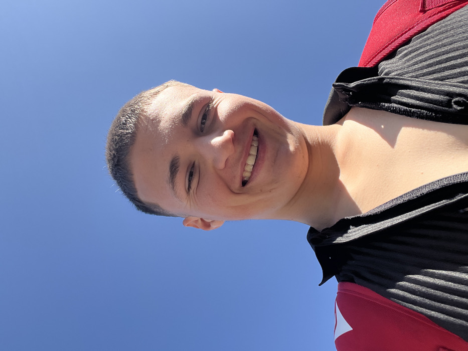 A young male individual is depicted in a close-up, low-angle selfie, smiling directly into the camera