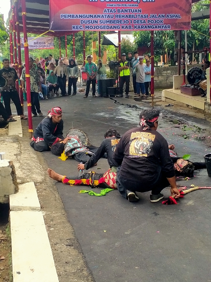 An outdoor scene in Dusun Sumberejo 1, Desa Pojok, Kecamatan Mojogedang, Kabupaten Karanganyar, Indonesia, depicts a performance or ritual taking place on an asphalt road