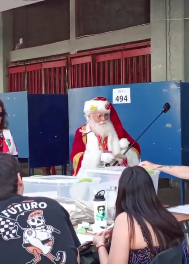 The video depicts an election setup in an outdoor setting. A person dressed as Santa Claus is seated behind a table labeled "Mesa 494" (Table 494), holding a stick with a camera on it. Other individuals are seated around the table, one wearing a shirt with a "Futuro Cambia el Presente" ("Future Change the Present") design. A woman with sunglasses stands beside the table. Several translucent boxes are on the table, and there are dividers behind it. A water bottle with a picture on it is also visible on the table. The area is under a red-painted overhang.