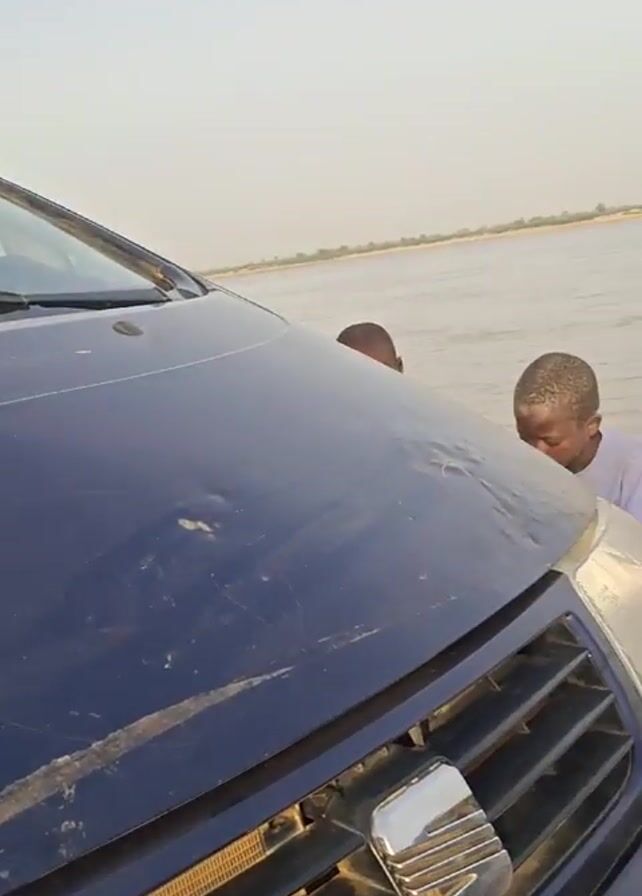 blue car on a wooden boat. The boat is on a river. Two young people are standing near the front of the car, and one appears to be crouching and peering over the edge of the boat. The car has visible scratches and damage to the hood. The river is wide with flat land visible in the distance on the opposite bank. The sky is a light, pale blue.
