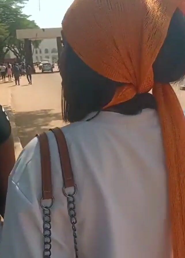 The video, taken from behind, follows two people as they walk down a road. The person in the foreground wears a white top and a bright orange headscarf. They carry a brown purse with a chain strap over their shoulder. Beside them, the second person wears a black t-shirt and holds a phone in their hand, occasionally lifting it up as if to take a picture or video. The road they're walking on is brown and appears to be dirt. In the distance, there is a large gate-like structure, and beyond that, a church. People can be seen walking around near the gate, and a few cars are driving on the road. The overall impression is of a sunny day at what could be a university campus or public area.