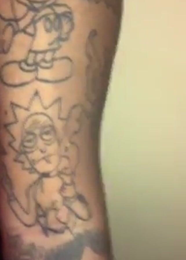 close-up view of a person's arm covered in multiple amateur tattoos. Starting from the top, there is a line drawing of Mickey Mouse, followed by text in gothic script. Below that is a line drawing of Rick from "Rick and Morty," holding a bong and giving the middle finger. Further down, there's a poorly executed, faded tattoo of a character holding a dollar sign and the words "Hope Mambura" are visible. The tattoos are black ink on brown skin. The arm is positioned against a light beige wall. The lighting is consistent throughout the video. The camera remains stationary.