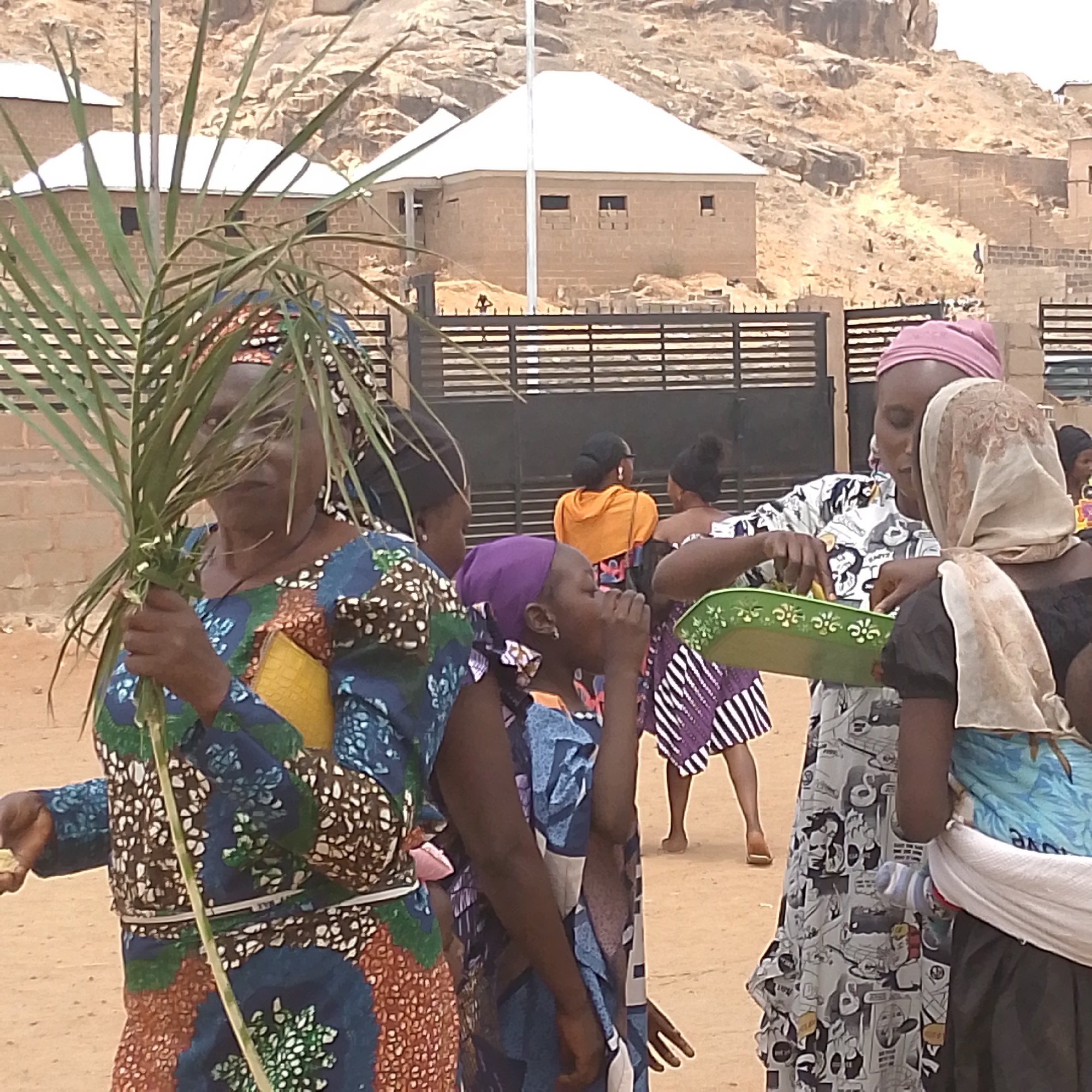 In Gura Top, Nigeria, a group of people stand in a sandy area near buildings with white roofs and a rocky hill in the background. A woman in a blue patterned dress holds a palm frond. Another woman, wearing a pink head covering, is offering food from a green tray to someone wearing a tan headscarf. A child with a purple head covering is drinking from their hands. Other individuals are visible in the background, with one wearing an orange shirt.