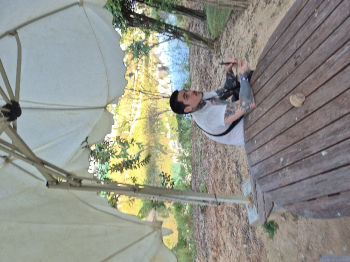 The image displays an outdoor scene in a lakeside recreational area of Da Lat, Vietnam, likely adjacent to Xuân Hương Lake. An adult male is seated on a wooden bench beneath a large, partially open white patio umbrella, positioned at a rustic wooden slatted picnic table. The man has dark hair, a mustache, and a short beard. He is wearing a white t-shirt and displays extensive dark tattoos covering both arms and his neck. A black strap, consistent with a shoulder strap from a bag, crosses his chest. He holds a dark, pen-like object in his right hand, with his forearms resting on his lap, and directs his gaze towards the right side of the frame. On the wooden table, a single small, light brown, rounded object is present. The immediate ground surface consists of dry, reddish-brown soil with scattered patches of green vegetation. In the mid-ground, a calm body of water reflects the sky and distant elements. The background reveals a green hillside with trees and several light-colored buildings on the opposite bank of the water.