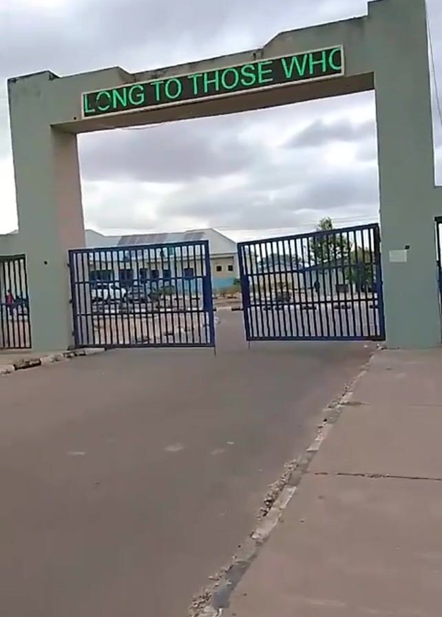 shot of an open gate with a sign above it