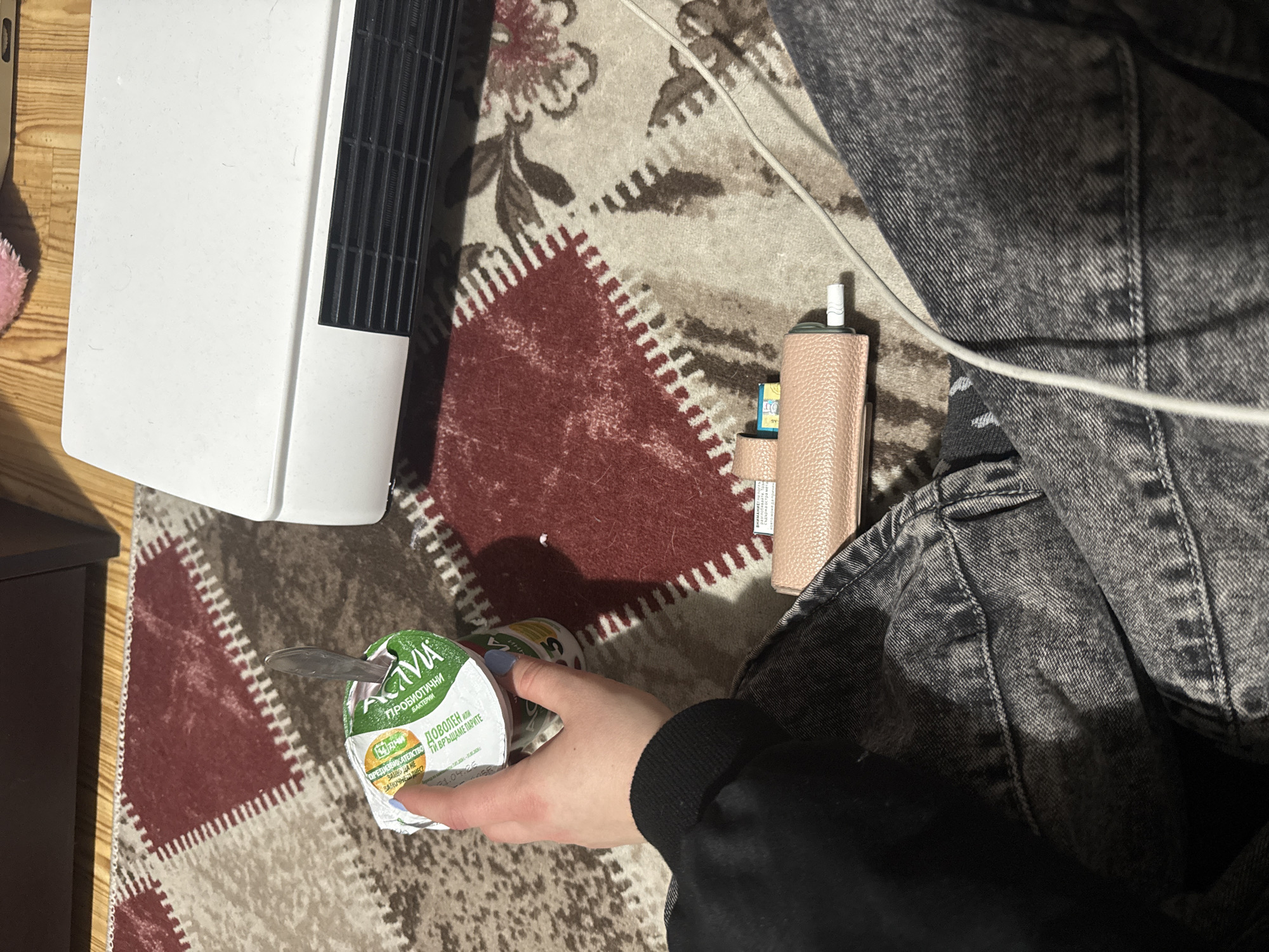 A top-down shot shows a person holding a spoon and a container of Activia yogurt, with the words "ПРОБИОТИЧНИ БАКТЕРИИ" visible on the label, while seated on a patterned rug. Adjacent to the yogurt is a small, cylindrical container, presumably another yogurt. To the left is a white tower fan, and to the right, the person's legs clad in dark-wash denim. A pink leather case with a white stick-like object and a small SD card is also visible on the rug. The text "ДОВОЛЕН ИЛИ ТИ ВРЪЩАМЕ ПАРИТЕ" is discernible on the yogurt container. No specific location in Yambol, Bulgaria can be determined.