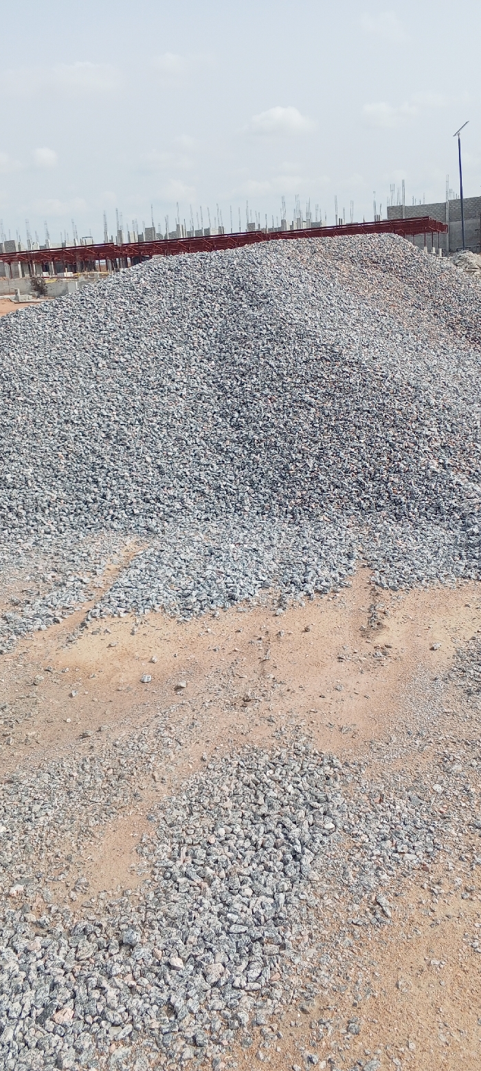 The image depicts an outdoor construction site under a partly cloudy sky. In the foreground and midground, a substantial, grey, angular crushed gravel pile occupies the center-left, with orange-brown soil and scattered gravel on the ground in front of it, showing faint tracks. In the background, an ongoing construction project is visible, featuring multiple unfinished concrete structures with vertical rebar extensions, and a prominent horizontal red-painted metal framework or scaffolding. To the far right, a tall pole equipped with a solar panel and a light fixture stands. No people are present in the scene. The location is an unspecified construction zone within the city of Unknown, Unknown.