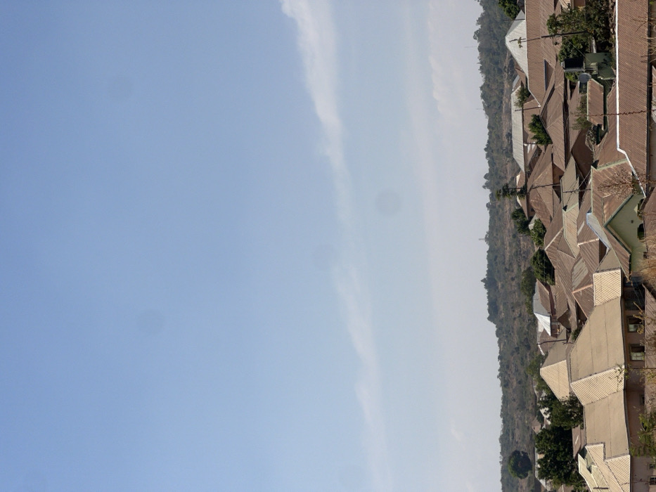An elevated long shot captures a residential area in Jos, Nigeria, under a bright, mostly clear light blue sky