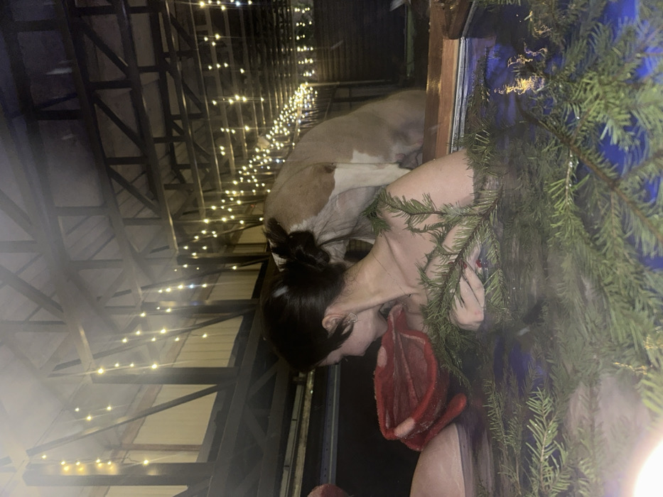 The image depicts a scene in Базарово, Russia, set within a dimly lit, semi-enclosed structure featuring exposed dark beams overhead, from which numerous small, warm-toned string lights are suspended. A female individual, with dark hair tied back, is submerged chest-deep in a body of water, likely a bath or small pool, which contains multiple evergreen pine branches floating on and beneath the surface. She is seen in profile, looking down and to her left, with a faint smile. A large, tan and white dog stands on the immediate edge of the water basin, behind the female, its head positioned near her upper back, obscured by her hair. A red, textured object, resembling a fabric hat or cloth, is visible partially submerged next to the female's left arm.