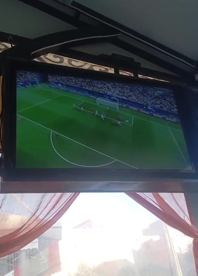 A television is mounted to the ceiling. On the screen, a soccer game is in progress. Players in white and red jerseys are visible on the green field. Below the television, a window offers a view of the exterior. Red curtains frame the window. A security camera is mounted above the television. The surroundings suggest the interior of a cafe or similar establishment.