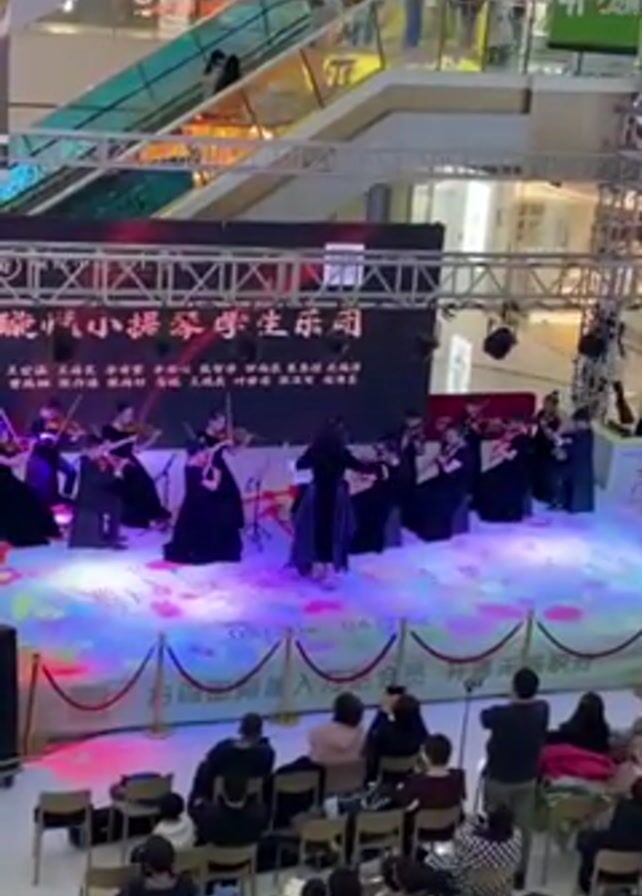 An orchestra performs on a small stage in the middle of a shopping mall. The orchestra consists of about a dozen musicians dressed in dark attire, playing violins. A woman, presumably the conductor, stands in front of the orchestra, gesturing with her hands. The stage is lit with colored lights, and a digital screen behind the orchestra displays Chinese characters. A crowd of people sits in chairs facing the stage, watching the performance. Some people are taking pictures with their phones. Escalators are visible in the background, along with the upper levels of the shopping mall. A sign indicating the 4th floor is also visible. A red rope surrounds the stage.