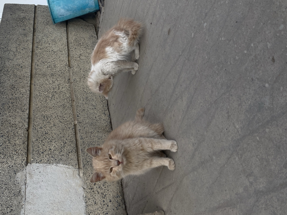 The image displays two cats on a concrete surface against a light grey concrete block wall in the city of Dobri dial, Bulgaria. In the left foreground, a light orange/tan colored cat is seated, facing forward, with its eyes partially closed. To the right, a second cat, white with light orange/tan patches, is seated with its head lowered towards its body, indicative of grooming or scratching. Both felines present with somewhat unkempt fur. A light blue plastic container is partially visible in the upper right background. The concrete ground beneath the animals exhibits minor wear and discoloration. The scene is illuminated by ambient daylight.