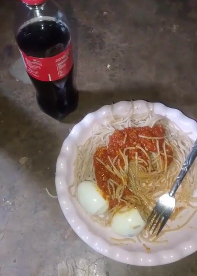 plate of spaghetti with tomato sauce and two halved hard-boiled eggs. A fork rests on the plate. A bottle of Coca-Cola sits beside the plate on a gray concrete surface.