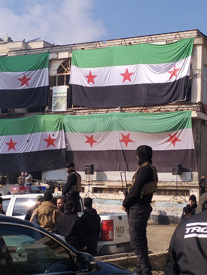 An outdoor scene in Ad Duwayr, Syria, depicts a public gathering in front of a multi-story building. The building's facade is prominently draped with multiple large green, white, and black horizontal striped flags, each displaying three red stars on the central white stripe. A white pickup truck, marked "MOI" in English and Arabic script on its tailgate, is parked centrally, featuring a heavy machine gun mounted on its bed. An armed man in black tactical clothing and a vest stands in the truck's bed, holding a rifle. In the immediate foreground, an individual in a black hooded top, black trousers, and a tan tactical vest stands with a rifle, facing away from the camera. Several other individuals, some armed and some in civilian attire, are present around the vehicles. Two black audio speakers on tripods are positioned behind the white pickup truck. A black sedan is partially visible in the left foreground.