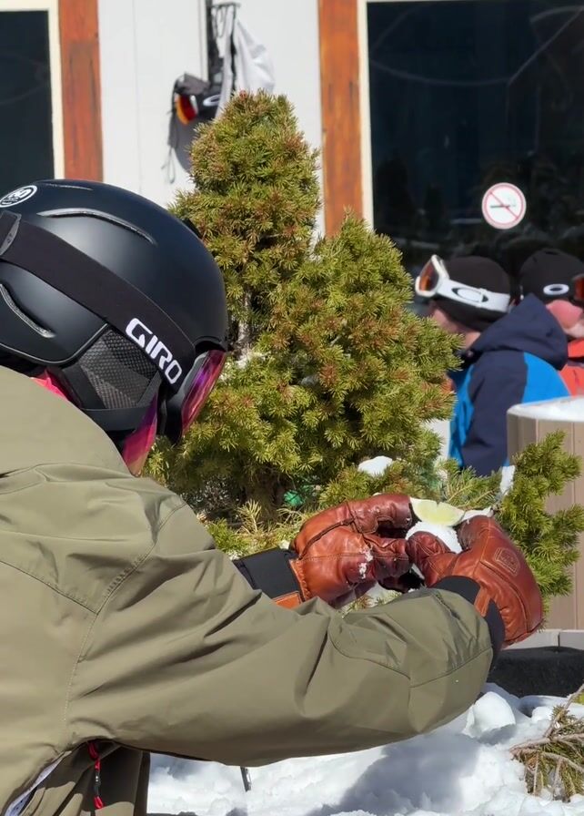 A person in a ski helmet, goggles, brown leather gloves, and an olive-green jacket forms a snowball