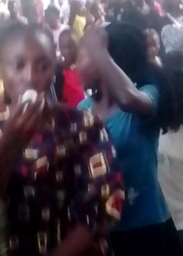 A chaotic, high-angle shot depicts a crowd of people indoors. Several individuals are visible, dressed in various casual clothes like blue, red, and patterned shirts. The camera moves erratically, making it difficult to discern specific actions, but the group seems active. The overall atmosphere appears frenzied or dynamic. The backdrop is indistinct due to the motion and focus.