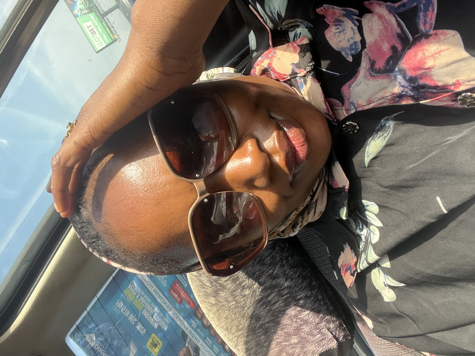 A dark-skinned individual, identified as female, is depicted in a close-up, front-facing perspective, seated inside a vehicle in Nyanya, Nigeria, during daylight hours under direct sunlight