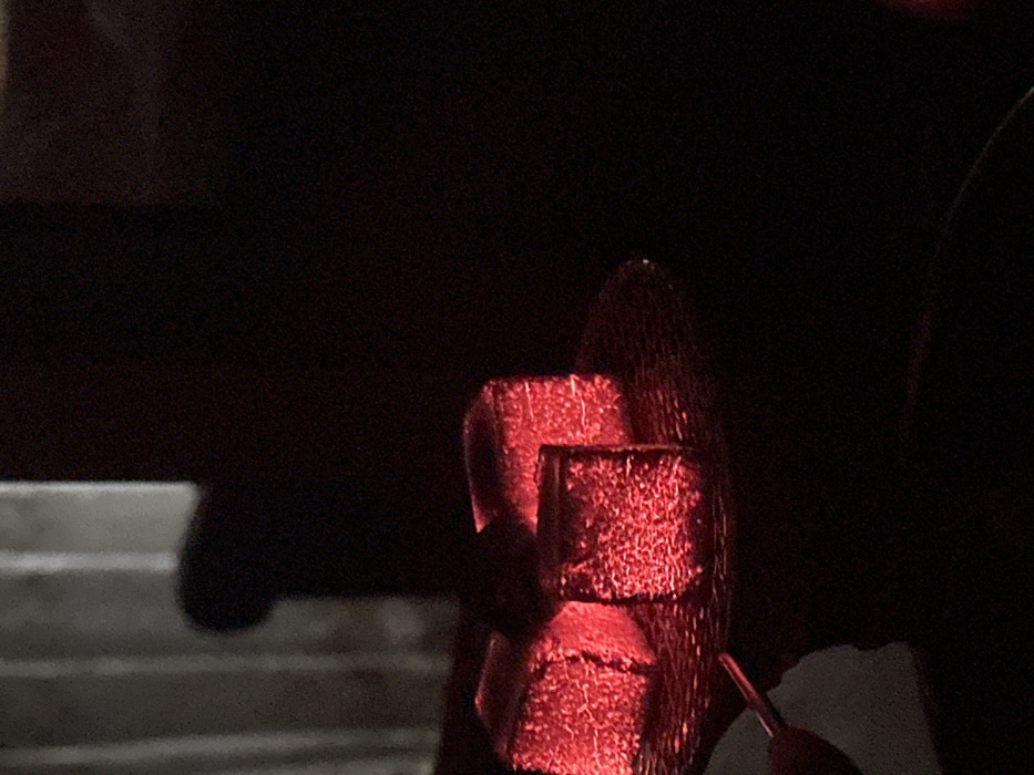 A forensic description of a dimly lit indoor scene located in Al-Muhajerin Municipality, Syria. The central focus is a dark, circular, textured tray upon which three intensely glowing, red-hot, cuboid charcoal briquettes are placed. These charcoal pieces emit a strong reddish-orange light, serving as the primary illumination source in the image. In the lower-left foreground, a dark, thin implement with a reddish tip, consistent with a charcoal poker or tongs, extends towards the edge of the tray. The background is predominantly obscured by deep shadow; however, in the upper-left quadrant, the indistinct silhouette of a dark, rounded object, possibly an armchair or sofa back, is discernible. Behind this silhouette, faint vertical strips of lighter tone are visible, consistent with curtains or blinds near a window, suggesting a subtle external light source or distant indoor illumination. No individuals are depicted, but the arrangement of the objects indicates recent human activity, likely the preparation or staging for the use of a hookah or shisha.