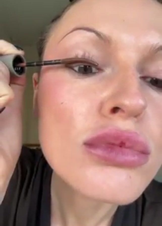 close-up of a woman's face as she applies mascara to her upper eyelashes. She holds the mascara wand with her right hand, and her left hand is out of the frame. The mascara is a dark brown color. The woman has fair skin, light pink lips, and light brown eyes. Her hair is pulled back, and she is wearing a dark brown top. The background is a light-colored wall.