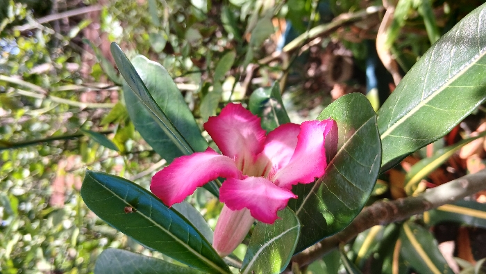 A close-up, outdoor photograph taken in La Tagua, Venezuela, depicts a single Adenium obesum (Desert Rose) flower in full bloom. The flower, positioned centrally, features five prominent petals exhibiting a gradient from vibrant fuchsia-pink at the edges to a lighter pink and white in the throat. It is surrounded by multiple glossy, dark green, ovate leaves. A small, reddish-brown insect, approximately 3 millimeters in length, is observed resting on the upper surface of a leaf in the upper-left quadrant. A portion of a light brown, woody stem is visible below the flower. The background consists of out-of-focus green foliage, indicating a natural or garden environment, illuminated by direct sunlight which casts dappled shadows on some leaves. No human subjects are present.