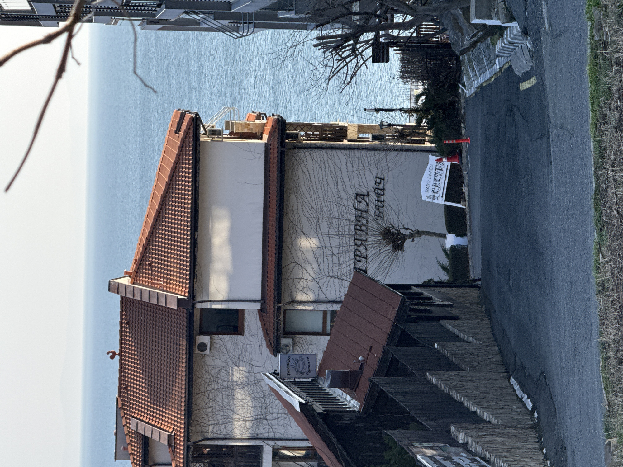 An eye-level, slightly downward-angled view captures a residential and commercial street descending towards the Black Sea in Sveti Vlas, Bulgaria, under a clear, light blue sky. The foreground features a strip of dry, light-brown grass. An asphalt road, appearing damp or recently used, leads into the midground. On the left, a multi-story building with a light-colored, possibly white or cream, facade and a red-tiled gable roof dominates. Its walls are extensively covered by the bare, dark tendrils of climbing vines. An air conditioning unit is mounted on its upper facade, and a second unit is visible further down. A red rooster weather vane is prominently positioned on the highest point of its roof, silhouetted against the sea. Below this structure, on the left, a smaller, dark-colored building with a similar red-tiled roof is visible, featuring a stone-clad base wall and sections of a wooden fence. A white sign with blue text in Cyrillic, reading "Бистро Одисей" (Bistro Odyssey) and depicting a stylized bowl, hangs from this smaller building. Further down the street, on the facade of the main building, the Cyrillic text "ГРИВНА БАИЧ" (Grivna Baich) is painted in dark letters, with a small, bare, severely pruned tree planted directly in front of it. To the right of the street, an A-frame signboard displays "BAR & DINER" at the top and "CACTUS" prominently below, with an orange traffic cone and a shorter orange bollard positioned nearby. A dark-colored lamppost stands behind these objects. The right side of the frame features part of a modern, multi-story building with dark grey paneling and balconies, partially obscured by bare tree branches in the immediate foreground. In the background, the calm, expansive blue waters of the Black Sea meet the horizon under the clear sky. No individuals are present in the scene, and no active interactions or movements are depicted.