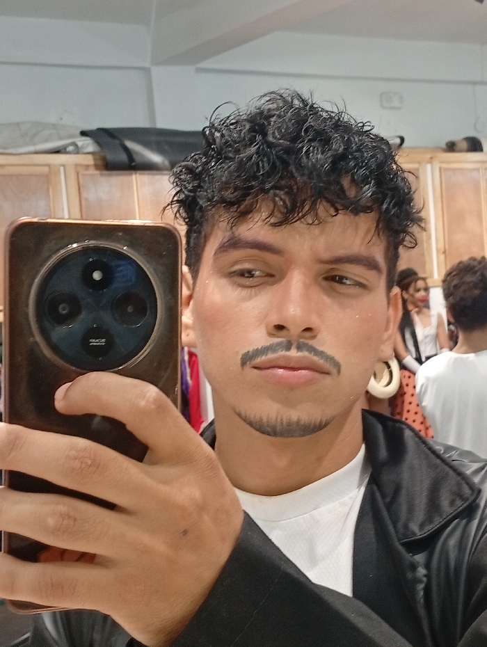 A young man takes a selfie with a smartphone. He has curly, dark hair and a painted-on mustache and goatee. He wears a white shirt and black jacket. The background is a room with wooden cabinets. Other people are visible in the background, including a woman in a polka-dot dress. The phone has three camera lenses on the back. The room appears to be a backstage area or dressing room.