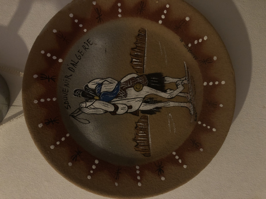 This image depicts a circular, sandy-textured decorative plate or wall hanging mounted on a light-colored wall in Saverne, France. The central artwork on the plate features a stylized illustration of a figure, identifiable by a black head covering and robes, riding a white dromedary across a sandy, desert-like landscape with brown, jagged hills in the background under a gradient blue-grey sky. The figure holds a whip or staff in its right hand and has blue fabric draped over its shoulder. The dromedary has black legs and saddle details in reddish-brown. Above the central illustration, black text reads "SOUVENIR D'ALGERIE." Faint, illegible script is present near the bottom right of the central image. The wide, sandy-brown outer border of the plate is decorated with alternating patterns of small white dots and stylized dark brown symbols, some areas showing a reddish-brown gradient. A thin white ribbon is visible at the top, securing the plate to the wall. A metallic, cylindrical object is partially visible above the plate, and a shadow is cast on the wall to the right.