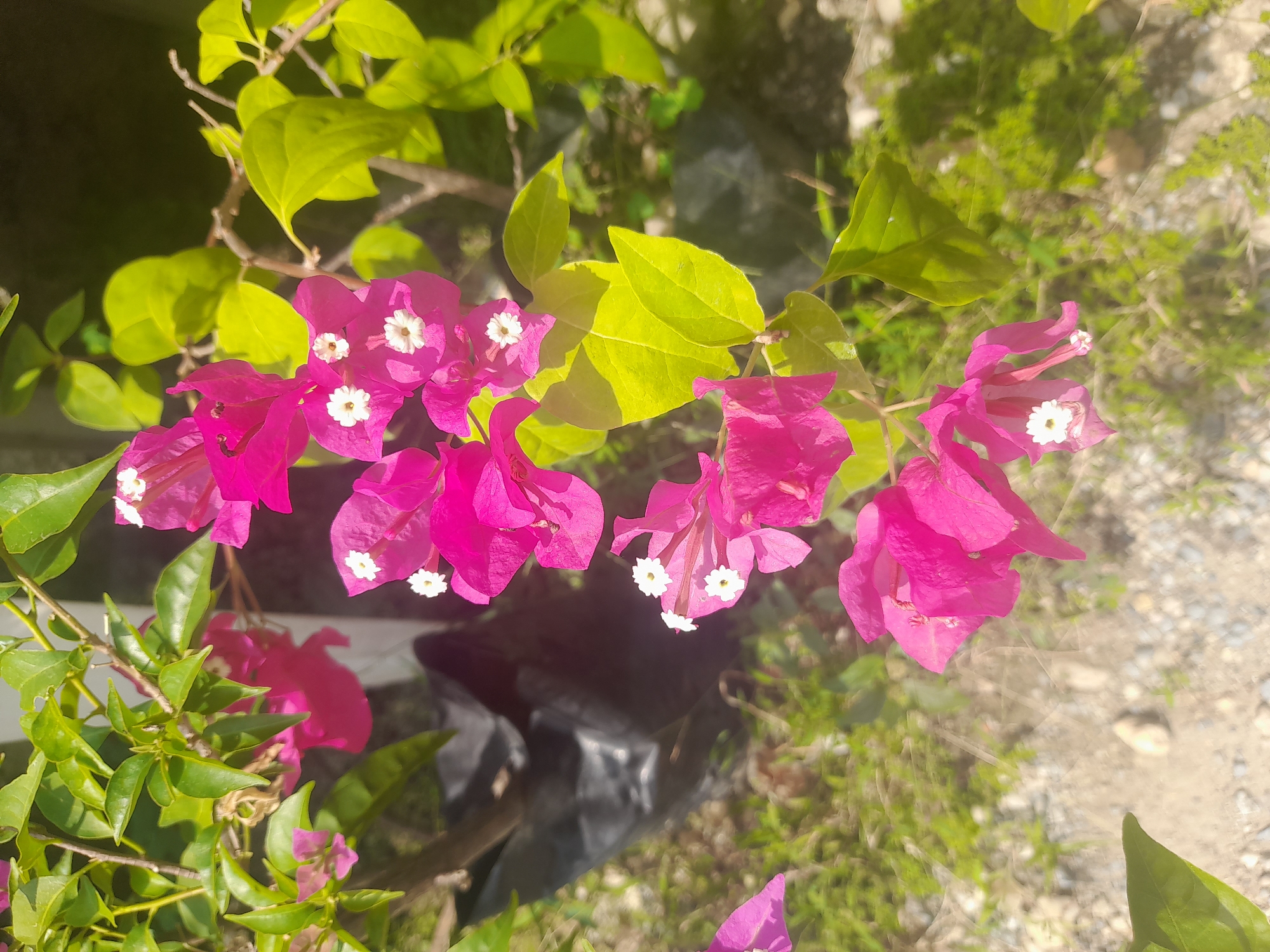 The image depicts a close-up of a vibrant pink bougainvillea plant in an outdoor setting