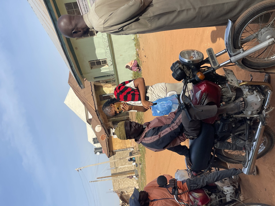 The scene depicts an unpaved outdoor area in Unguwar Gabas, Nigeria, under a clear blue sky, likely during daylight hours