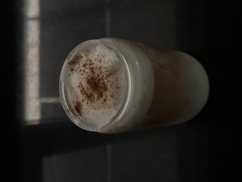 The image presents a clear, cylindrical glass containing a layered beverage, centered against a dark, indistinct background. The beverage is stratified into three discernible layers: a opaque white base, a translucent light brown middle layer, and a thick, white foamy top layer. The foam is unevenly garnished with a reddish-brown granular powder, consistent with cinnamon or cocoa. The dark background shows subtle, diffused reflections indicative of a smooth, flat surface under ambient lighting. There are no individuals, specific architectural details, or unique objects present to determine the precise location within Mexico City, Mexico.