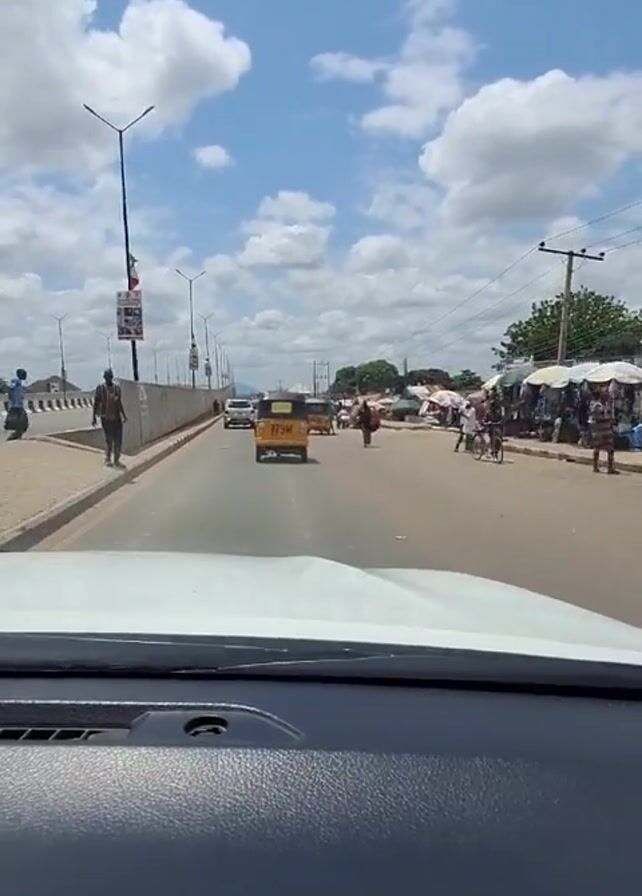 The video is taken from the dashboard of a car as it drives on a road in an urban area. The sky is blue with puffy white clouds. There are street lights lining the road. In the distance, a market scene is visible with stalls and people milling around. Several yellow auto rickshaws, commonly known as “Keke Napep” in Nigeria, are on the road. People are walking on the side of the road, some carrying goods. The overall scene appears to be a typical day in a busy commercial area.