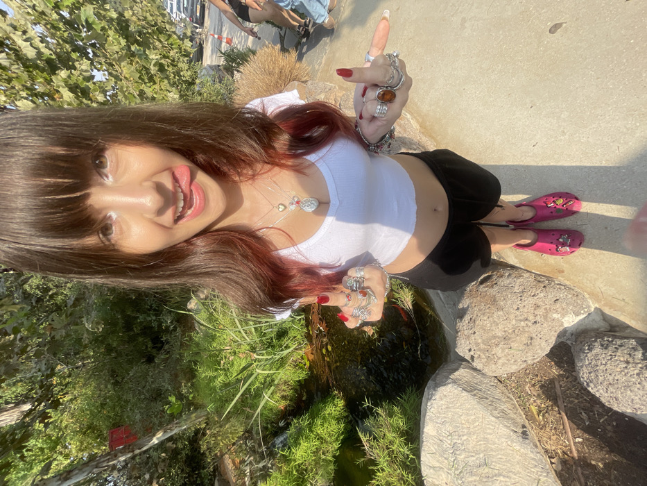 An image captured outdoors in Tel Mond, Israel, depicts a young female subject standing centrally, facing the camera with a wide-eyed expression, open mouth, and tongue extended to her right. She has long, dark brown hair with reddish highlights and bangs. She is wearing a white ribbed crop top, black shorts, and pink Crocs adorned with Jibbitz charms. Numerous silver-toned rings are visible on both hands, some featuring prominent red or amber-colored stones. Her fingernails are painted red. Multiple necklaces, including a small heart pendant and a larger oval pendant, hang around her neck. Both of her hands are raised, with the middle finger of each hand extended upwards. The background to the left of the subject features a small body of water, possibly a pond or stream, with green aquatic vegetation and several large, irregular rocks bordering it. Dense green foliage and trees are visible behind the water, and a red rectangular object hangs from a tree branch in the upper left quadrant. The background to the right consists of a light-colored paved surface, likely concrete or asphalt. In the distance on the right, multiple parked vehicles are visible, suggesting a parking area or street. A partial view of another individual's lower body is discernable in the far right background. The scene is illuminated by bright daylight, casting visible shadows.