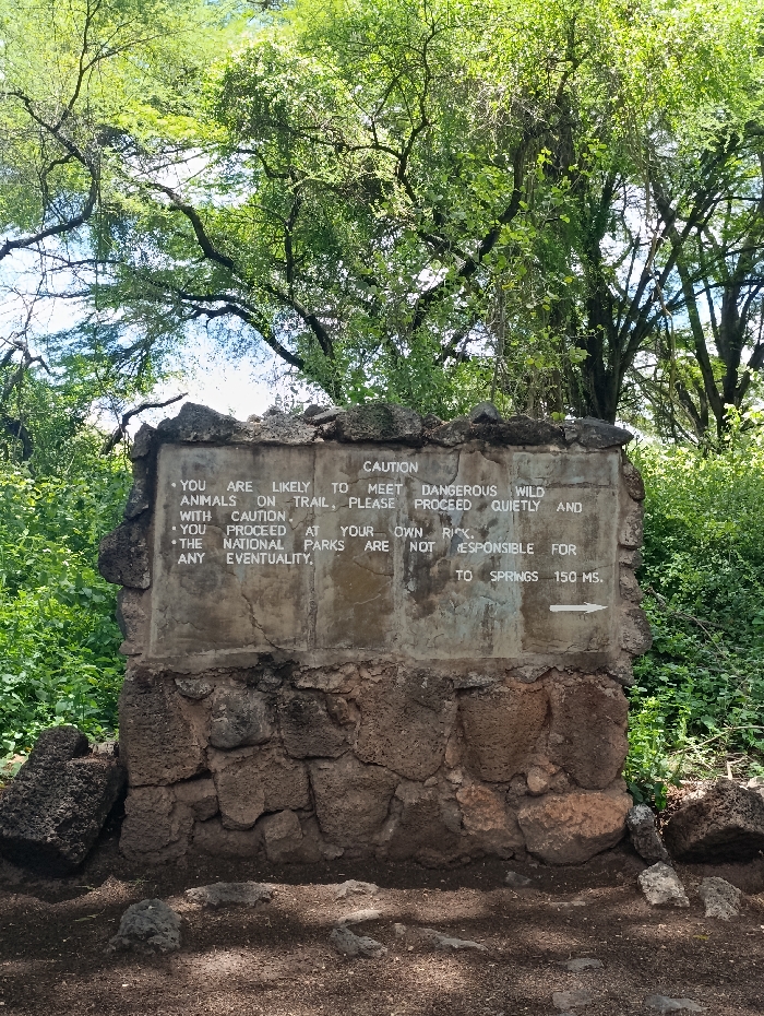 A stone sign is situated in Tsavo North National Park in Kenya, at the coordinates -2.983, 38.022. The sign is a weathered, rough-hewn stone structure, with white painted text. The sign is surrounded by a grassy area. The text warns visitors to proceed quietly and at their own risk, as they are likely to meet dangerous wild animals on the trail. The sign also states that the National Parks are not responsible for any eventualities. An arrow points to the direction of the springs, which are 150 meters away. Dense foliage, likely of Acacia trees, is visible in the background.