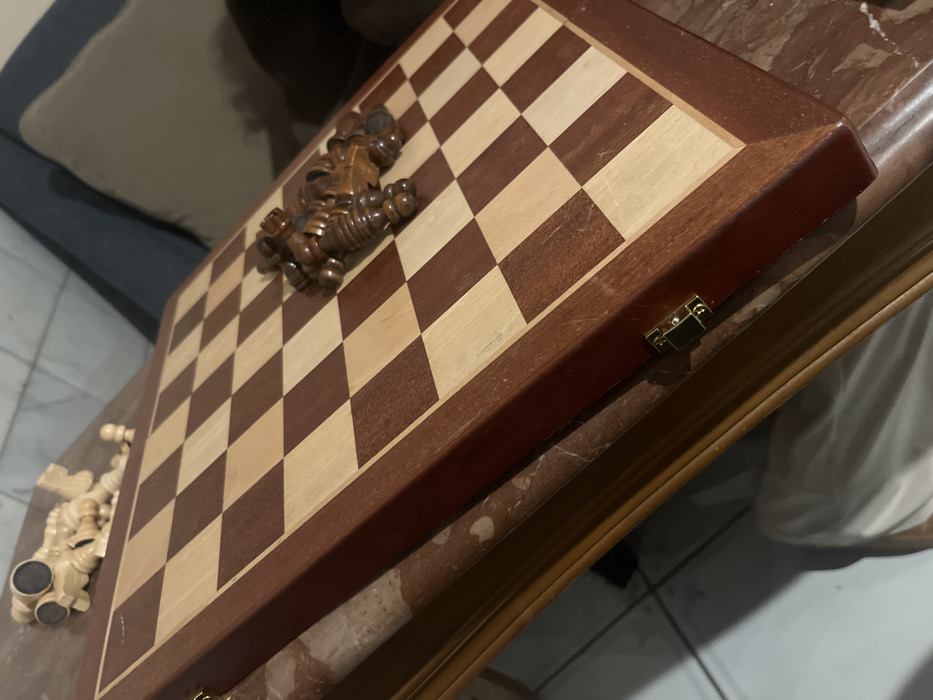 A close-up shot displays a partially filled wooden chess set. The board, with alternating light and dark squares, is positioned diagonally on a marble-topped table. Brown chess pieces, including what appears to be a knight and several pawns, are scattered across the board's surface. The chess set case features a brass clasp and a rich wood finish. A cream-colored cushion of a sofa is partly visible in the background.
