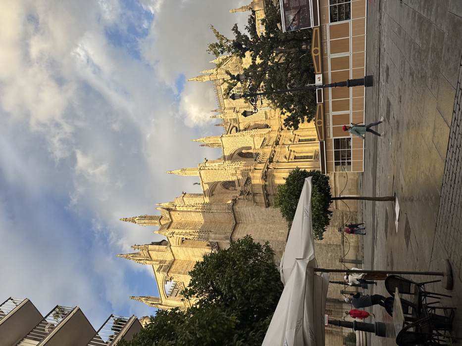 - "The image depicts a street scene in Sevilla, Spain, dominated by the Cathedral of Sevilla, specifically its Gothic exterior featuring numerous flying buttresses, spires, and intricate stonework, illuminated by a warm, angled light suggesting late afternoon or early morning" by FM-AgjPG3, licensed under CC BY 4.0