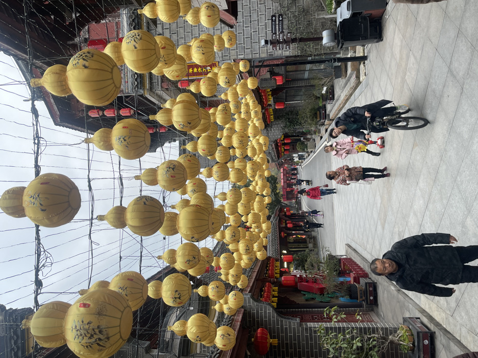 The image displays a pedestrian street in Bishan, China, illuminated by natural light under an overcast sky. A dense canopy of numerous yellow, gourd-shaped lanterns, each adorned with subtle dark floral or calligraphic designs, is suspended overhead by wires extending across the thoroughfare. The street is paved with grey tiles and flanked on both sides by traditional Chinese architecture featuring dark grey brick facades, dark tiled roofs, and red accents including hanging lanterns and visible window frames. Multiple individuals are present on the street. In the immediate foreground on the left, an adult male in a dark puffer jacket walks towards the camera. On the right side of the street, a person in a dark coat rides a black bicycle towards the viewer. Adjacent to the cyclist, an adult in a patterned brown coat walks alongside a child in a pink jacket, who is pushing a yellow and red scooter. Further down the street, additional pedestrians are observed walking in various directions. Traditional red lanterns are visible hanging from the eaves of the buildings, and potted plants, including bonsai, are placed along the storefronts. A multi-directional wooden signpost is visible on the right side of the street, next to a black trash receptacle.