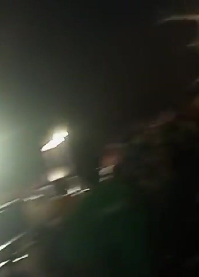 nighttime scene with a large crowd. There are two illuminated structures in the background with what appears to be stars on top. Bright lights are shining, which makes it difficult to see clearly. The camera moves through the crowd, showing people wearing various clothing, and then focuses on a stage with bright lights.
