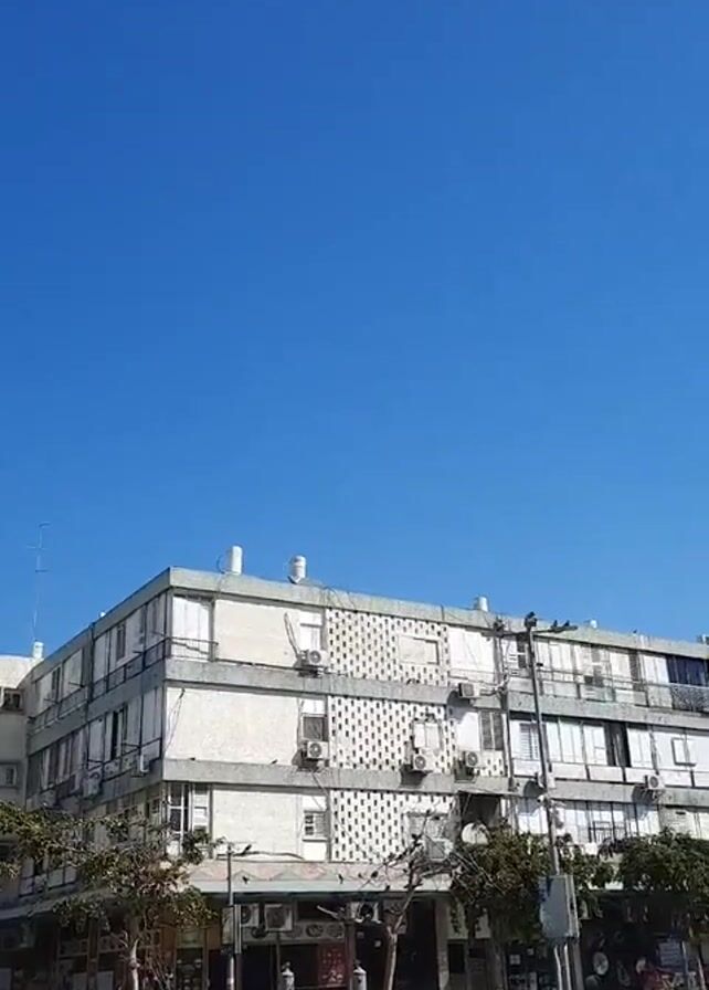 four-story building with a storefront on the ground level. The building is painted white with gray accents. There are many air conditioning units on the sides of the building. Several trees in front of the building are partly obstructing the view of the storefront. In the plaza, there are pigeons and a person sitting on a bench. The sky is a bright blue, and there is a black object in the sky that is not identified.
