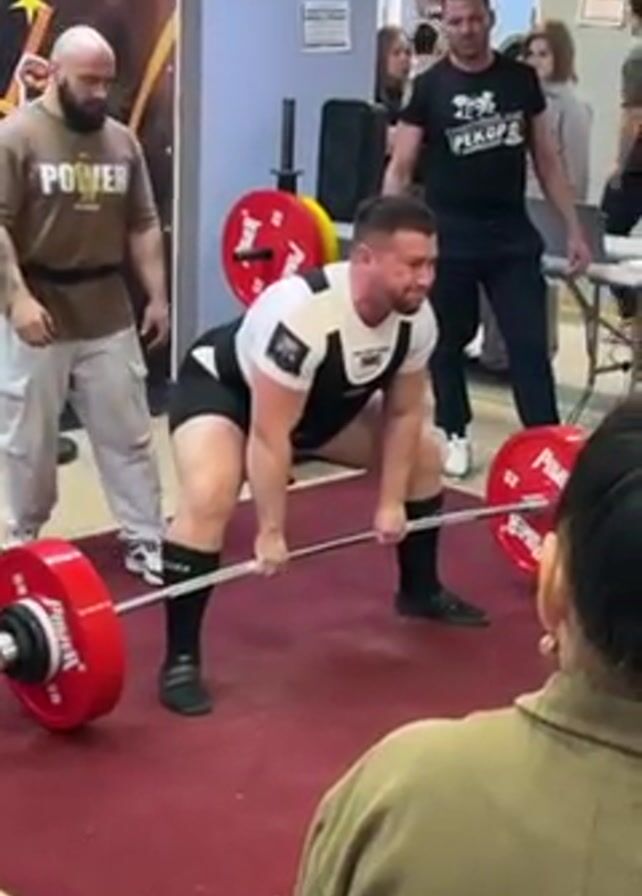 man lifting a barbell in what appears to be a powerlifting competition. The man is wearing a black and white lifting suit, black socks, and black shoes. He also has a weightlifting belt around his waist. The barbell is loaded with large red plates. He successfully lifts the weight and then appears to celebrate, hitting his thigh with his hand. Two men, possibly judges or coaches, stand behind him. One is wearing a brown shirt and light-colored pants, and the other is wearing a black t-shirt and black pants. The background shows a banner and other people watching the lift. The floor is covered with a red carpet. A woman's head is visible in the foreground, suggesting the video is taken from the audience's perspective.