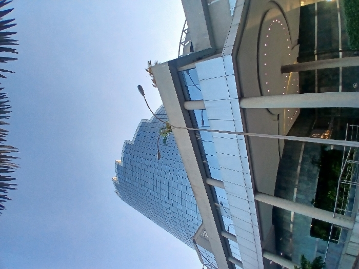 A modern glass-covered skyscraper angles upward, reflecting the bright blue sky. Its stepped top edges give it a distinctive profile. Attached to the skyscraper is a large, covered entrance featuring a circular ceiling adorned with inset lights. Tall, round support pillars frame the entrance, while a streetlight stands nearby. Part of a palm tree is visible on the left.