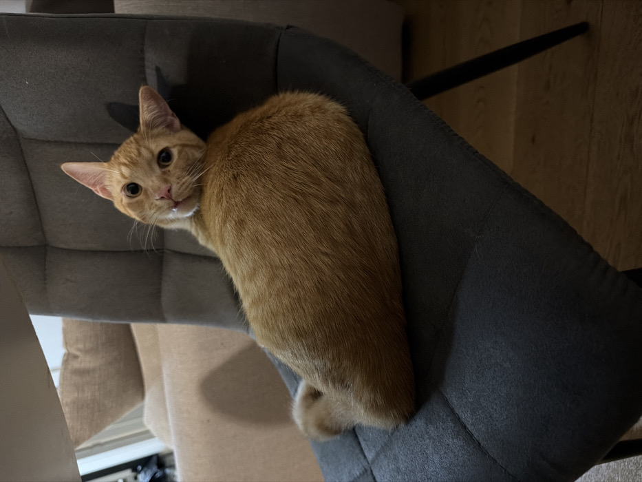 - "An orange tabby cat sits perched in a gray chair" by FM-GuW672, licensed under CC BY 4.0